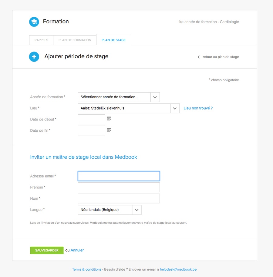 Cliquez sur le lien jaune pour adapter votre plan de stage, et ensuite sur le bouton vert « Ajouter période de stage ». Si, pendant une année de formation, vous effectuez un stage dans différents services ou hôpitaux, vous pouvez ajouter toutes ces périodes de stage.