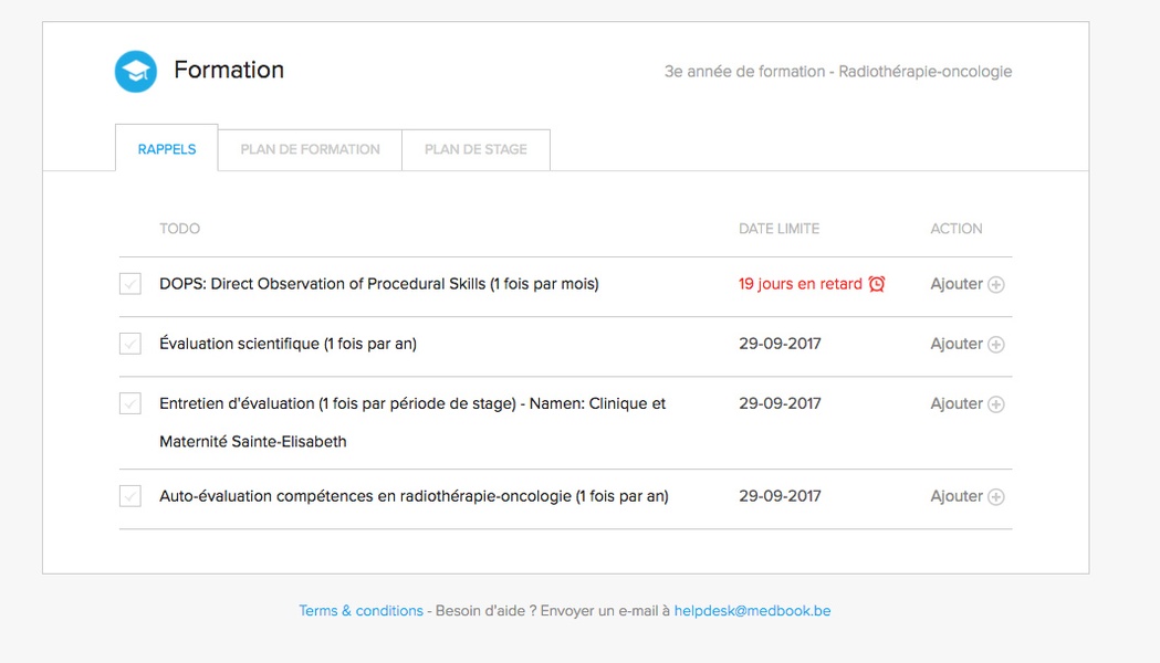 Sur la page d'accueil, Medbook donne un aperçu des éléments les plus récents qui ont été ajoutés à votre journal. En outre, vous avez également plusieurs rappels. Des éléments que vous devez terminer pour votre Master après Master par exemple, comme la participation à un cours. Ou par exemple un entretien d'évaluation associé à votre période de stage actuelle.